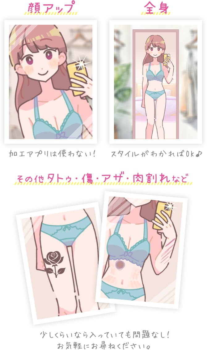 送信する写真は加工アプリを使用せず、顔・全身の写真をお送りください。またタトゥーや傷があれば範囲がわかるように撮影してください。